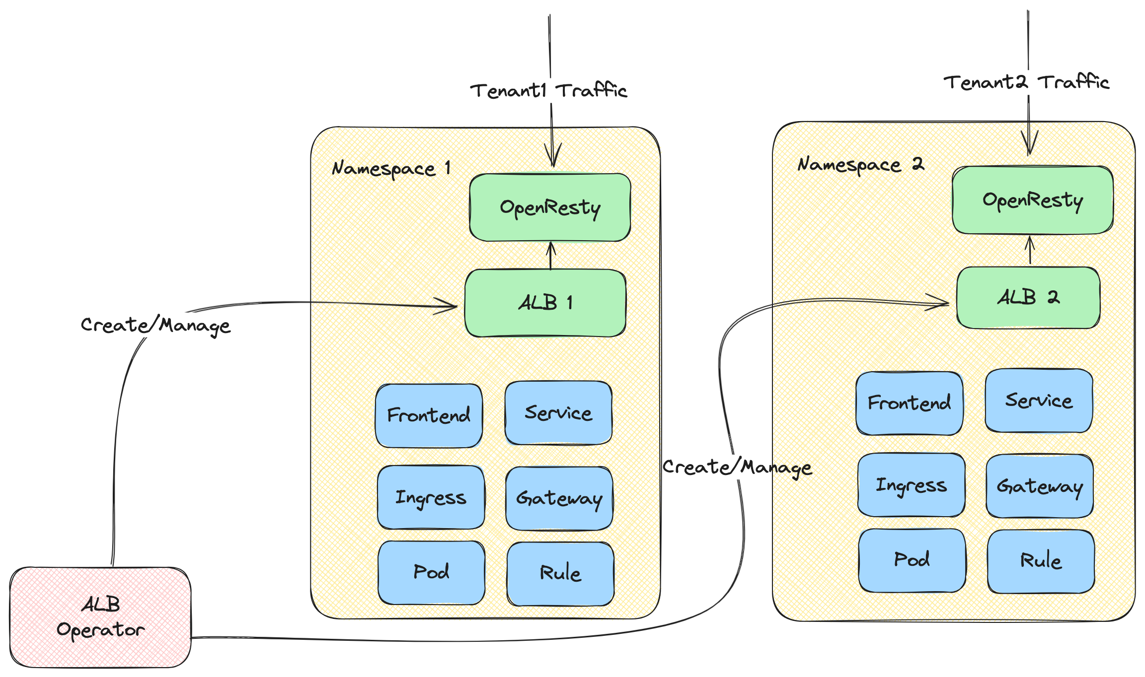 • ALB Operator: An operator that manages the lifecycle of ALB instances. It watches ALB CRs and creates/updates instances for different tenants.