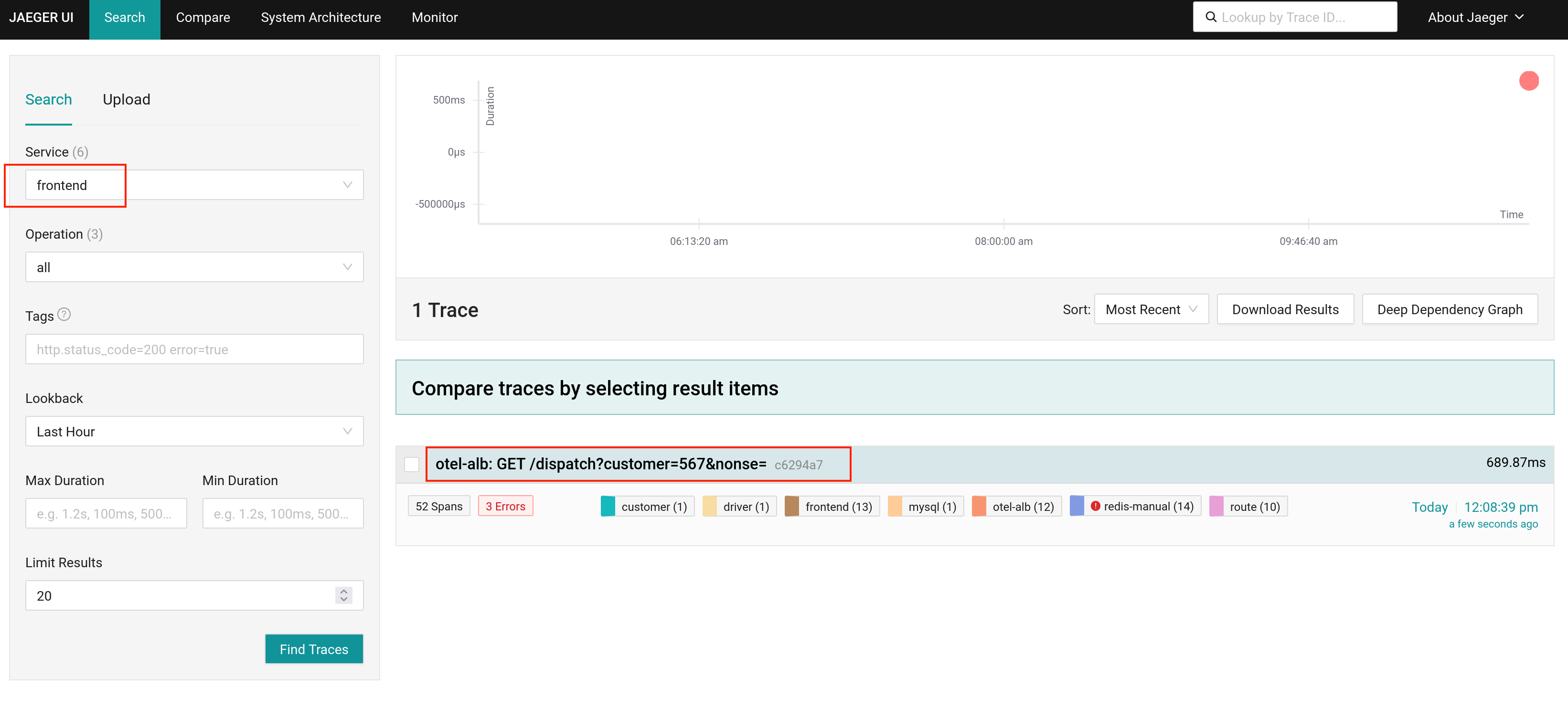 5. Execute the following command to send a request to HotROD via ALB. Here, ALB will report the Trace to Jaeger.